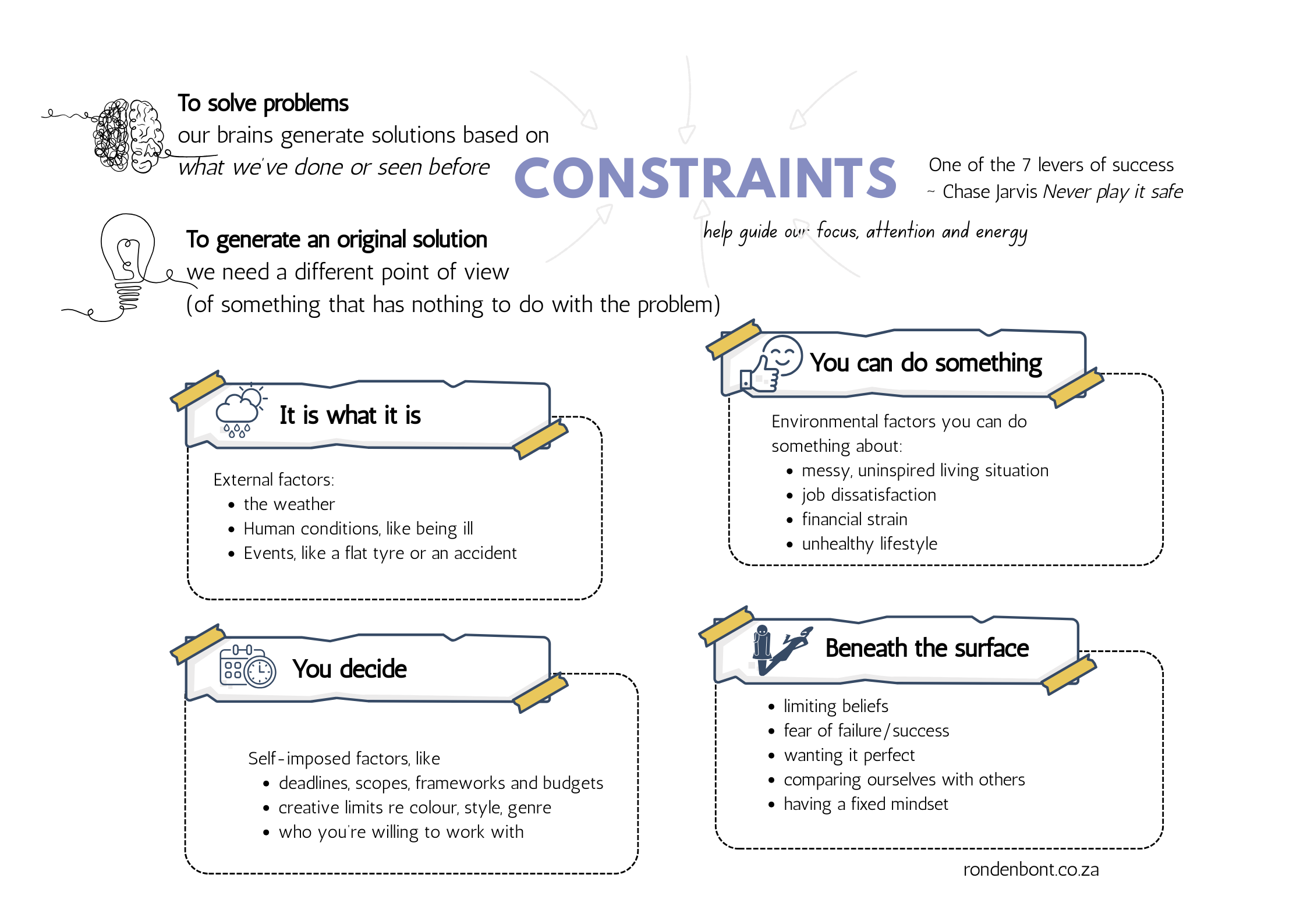 Chase Jarvis mentions seven levers that can help us live a creative life in his book Never play it safe. Here is a visual summary of the fourth one: Constraints. The other levers are attention, time, intuition, play, failure and practise. ...
