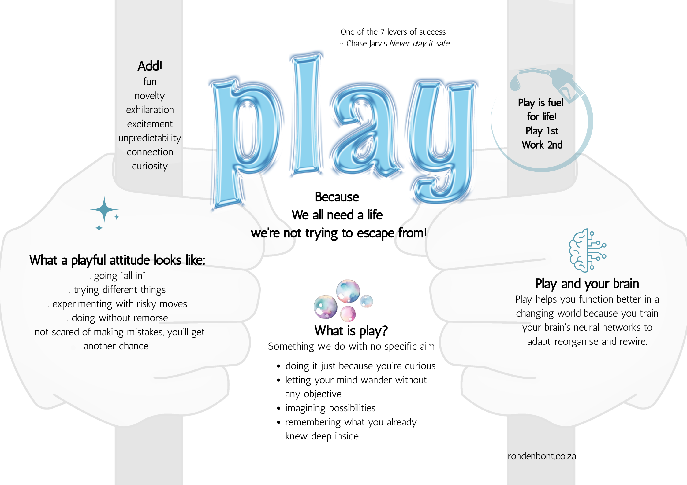 Still busy with the levers to success as mentioned by Chris Jarvis in his book Never play it safe. Here is number 5: Play. The other levers are attention, time, intuition, constraints, failure and practise. ...